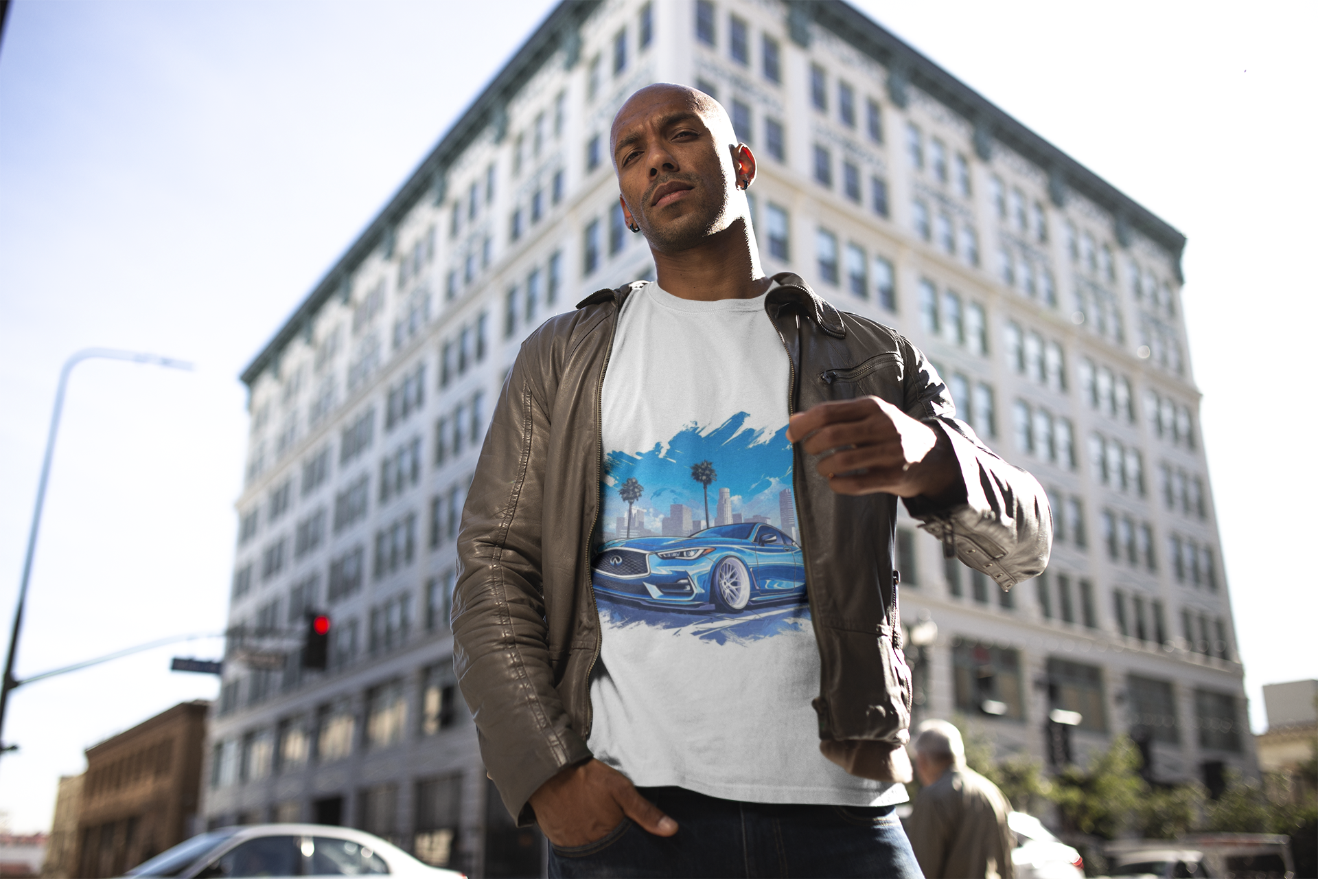 Upgrade your street style with this Blue Skyline Street t-shirt, featuring a sleek modified sports car set against a modern city skyline and palm trees.