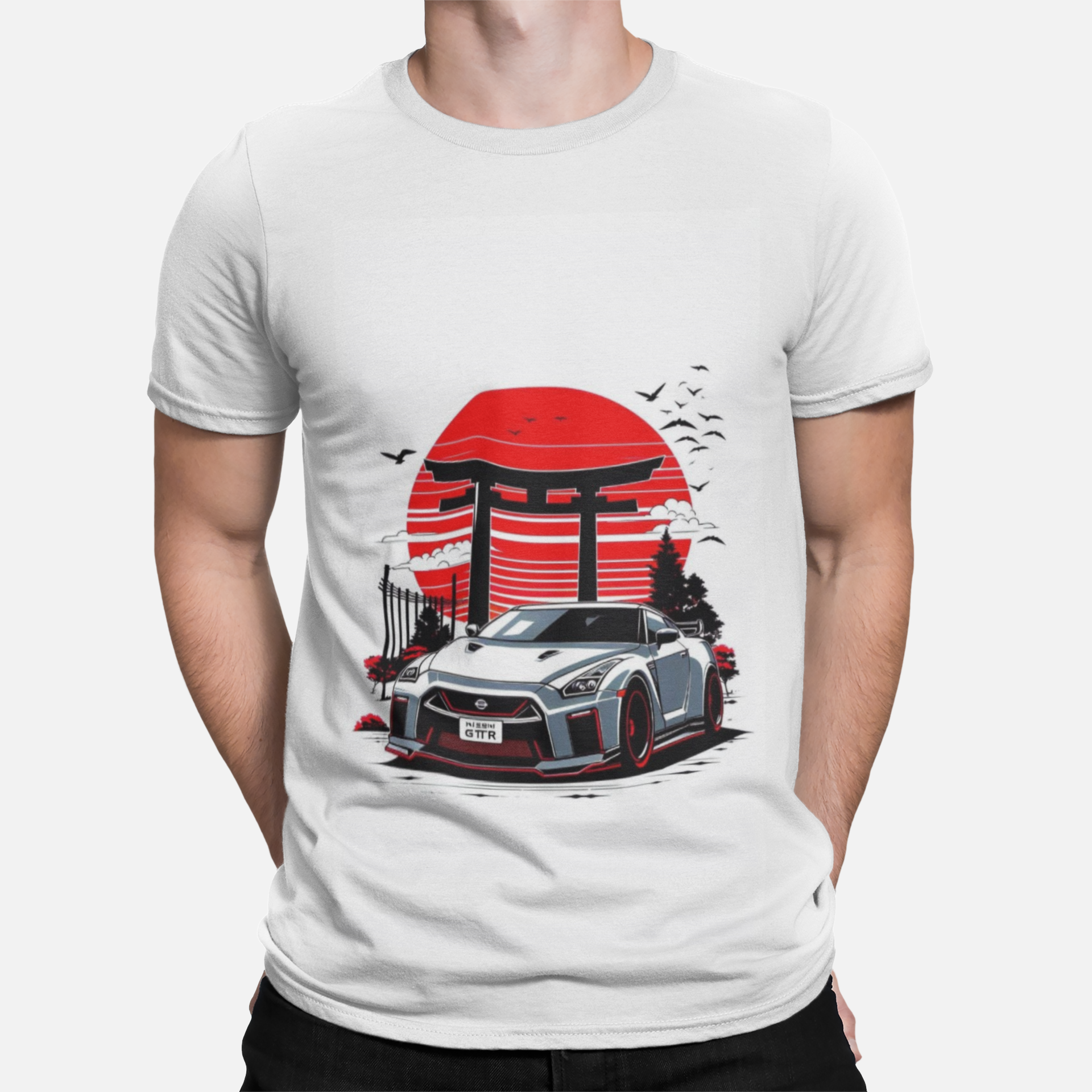 Premium JDM-inspired t-shirt featuring GTR with rising sun artwork. Perfect for car lovers and streetwear fans.