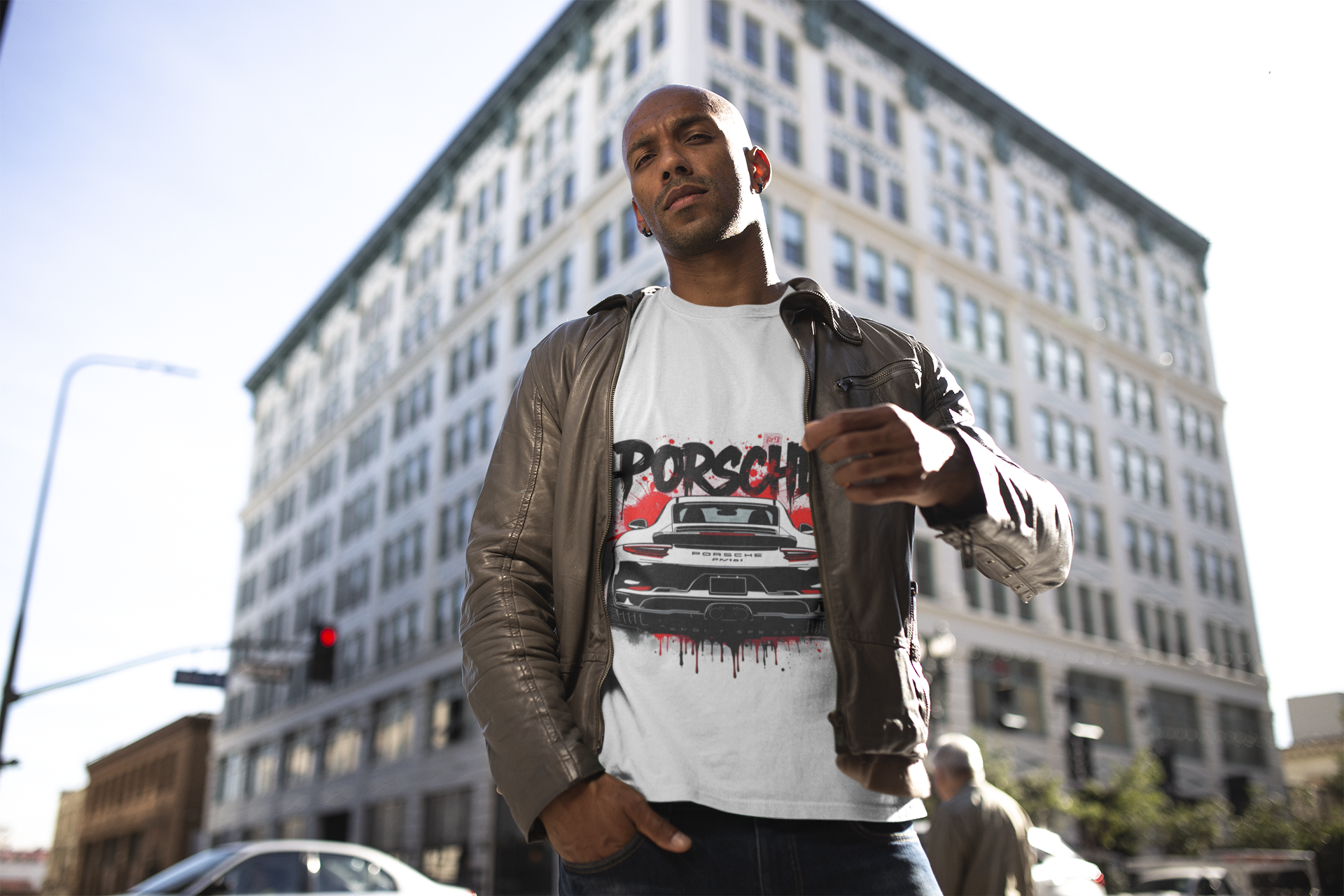 The Porsche Street Art t-shirt is inspired by high-performance supercars and modern graffiti culture. Featuring a powerful rear-view Porsche illustration with paint-splatter effects, this design represents confidence, dominance, and pure automotive style.