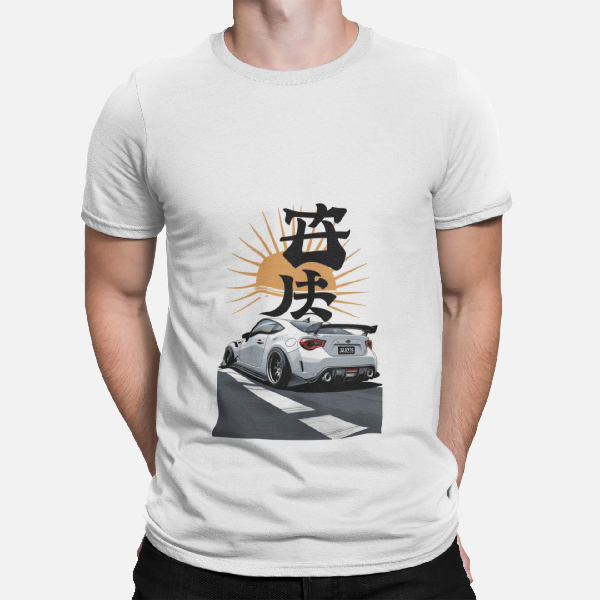 The Rising Sun Drift t-shirt is inspired by Japanese street racing culture and minimalist art aesthetics. Featuring a clean rear-view sports car against a golden rising sun with Japanese typography, this design represents focus, balance, and the silent confidence of true car enthusiasts.