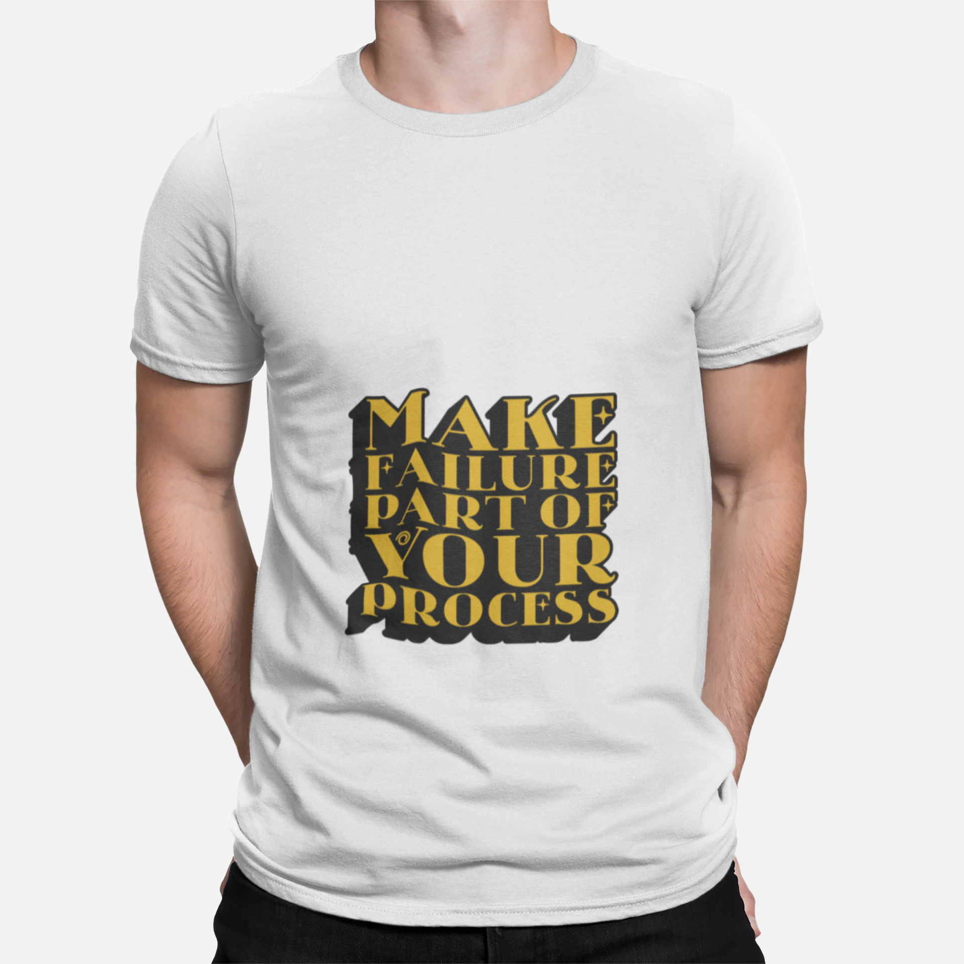 The design features bold stacked typography with the quote “Make Failure Part of Your Process”, styled in a strong gold and black layout for a powerful motivational look. This tee represents resilience, discipline, and the mindset of successful creators and entrepreneurs.